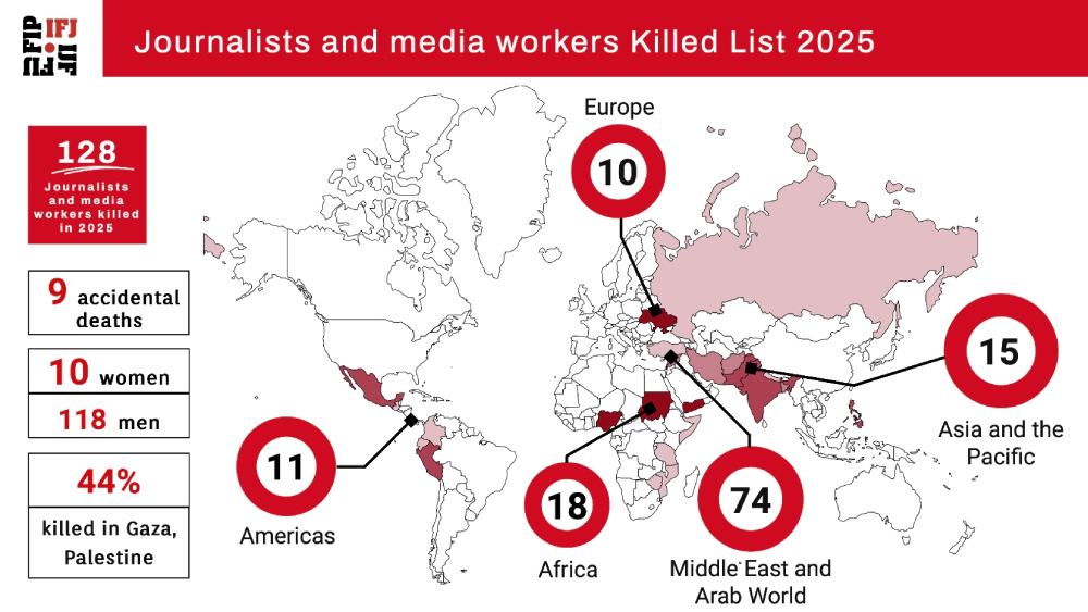 BRUSSELS: A total of 128 journalists, including 56 media professionals in Gaza, were killed around the world in 2025, the International Federation of Journalists said on Thursday.