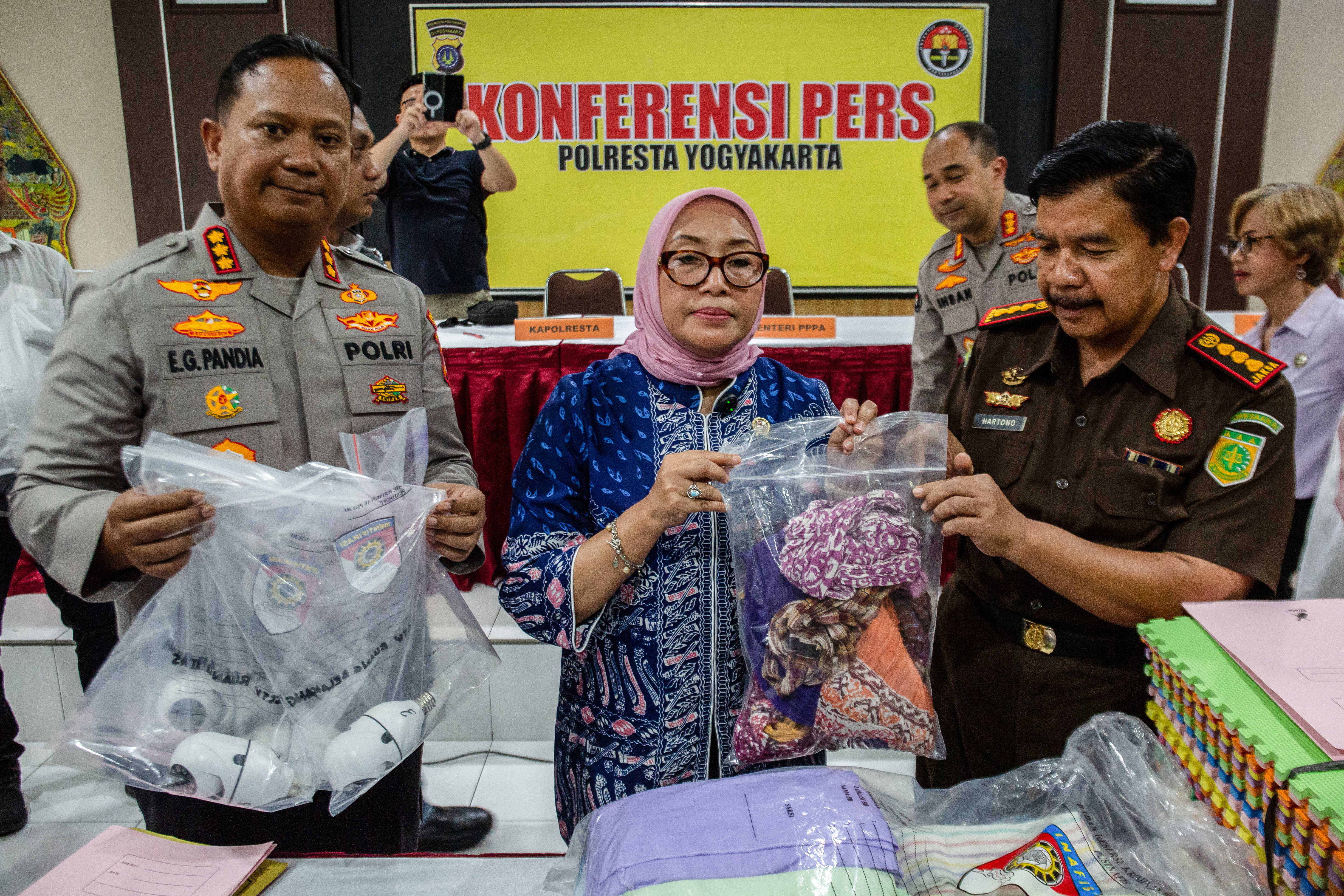 Arifah Choiri Fauzi (C), Indonesia's minister of women's empowerment and child protection, holding evidences poses for photograph during a press conference on a child abuse probe at a daycare centre, in Yogyakarta on April 27, 2026.