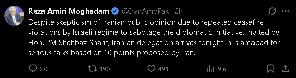 Iran's ambassador to Pakistan, Reza Amiri Moghadam, had earlier said in a post on X on Thursday, "Despite skepticism of Iranian public opinion due to repeated ceasefire violations by Israeli regime to sabotage the diplomatic initiative, invited by Hon. PM Shehbaz Sharif, Iranian delegation arrives tonight in Islamabad for serious talks based on 10 points proposed by Iran." However, the post was later deleted.