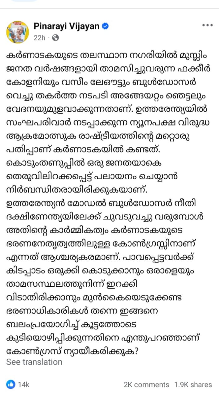 In a Facebook post, Vijayan referred to the reported bulldozing of Fakir Colony and Waseem Layout, where Muslim families had been living for many years.