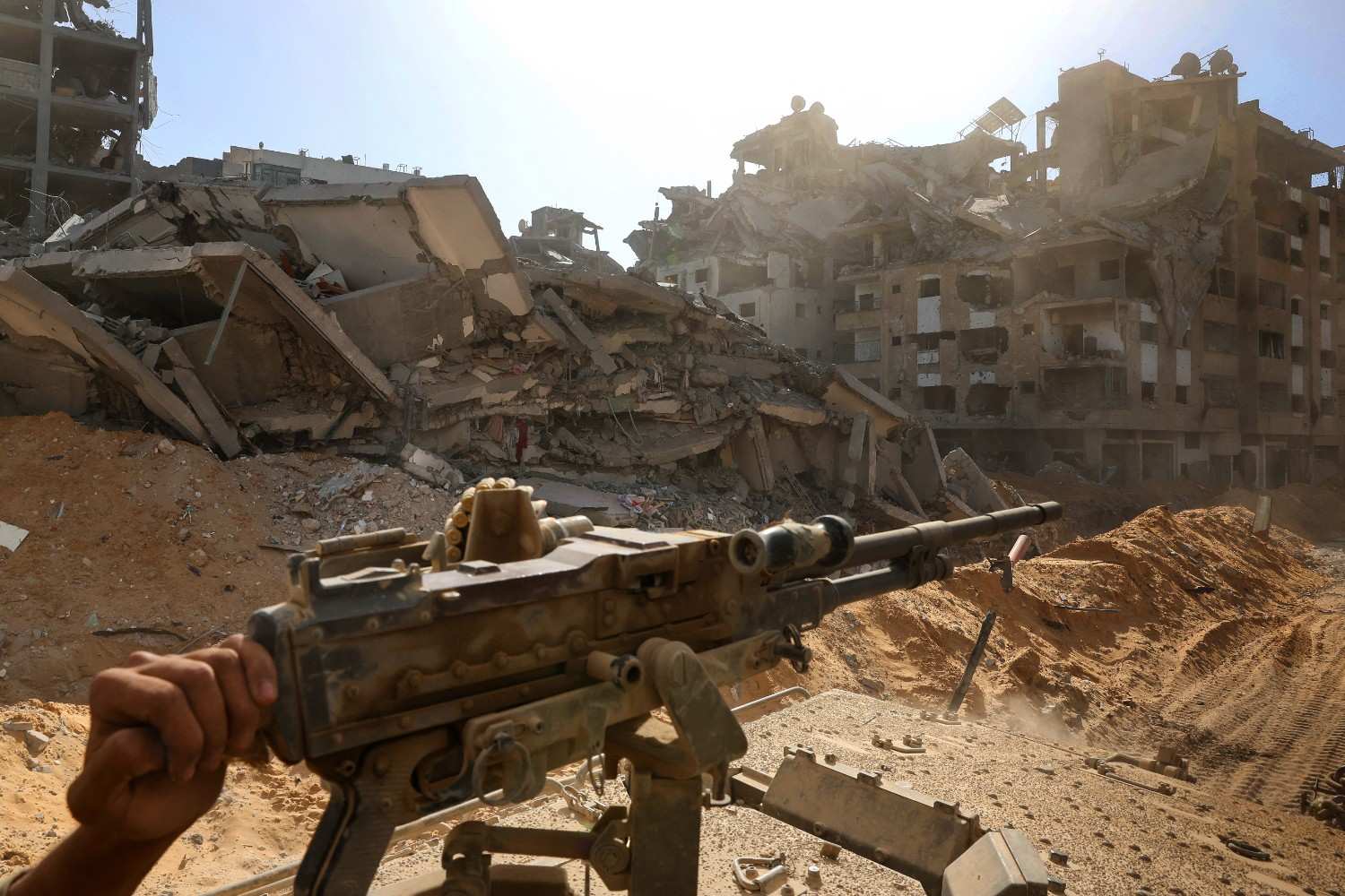This picture taken during a media tour organised by the Israeli army on October 3, 2025, shows an Israeli army soldier holding a mounted machine gun in front of destroyed buildings in the vicinity of the Jordanian Field Hospital in Gaza City. (AFP/File)