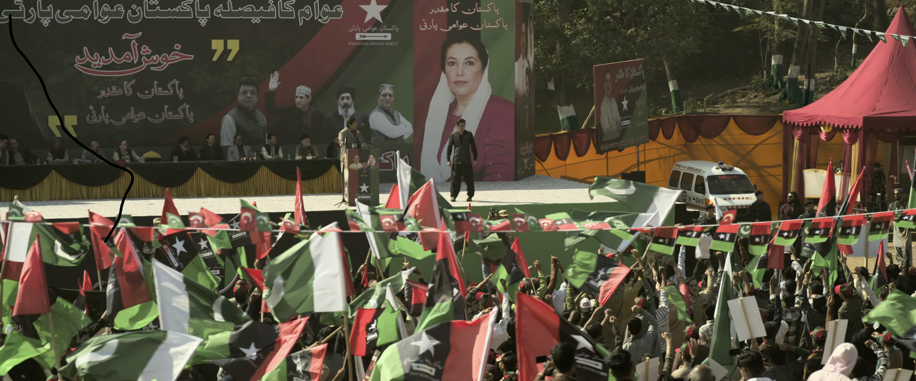 It also appropriates real-life specific political imagery and symbolism, such as a Pakistan Peoples Party (PPP) rally, photos of the late Benazir Bhutto, and authentic party flags, which have provoked additional criticism and scrutiny.